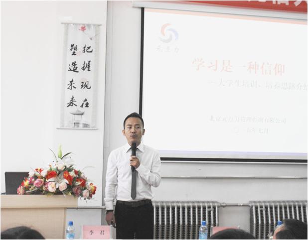 在張映君董事長(zhǎng)慷慨激昂的講話后,特訓(xùn)營(yíng)所有成員紛紛上臺(tái)做自我介紹。北京元點(diǎn)力公司項(xiàng)目經(jīng)理穆春松老師以“學(xué)習(xí)是一種信仰”為題,提出了希望通過(guò)這次細(xì)膩規(guī)范的入職培訓(xùn),可以將大家從新人逐漸培養(yǎng)成為組織人、工作人、職業(yè)人、企業(yè)人,系統(tǒng)專業(yè)的培訓(xùn)將加速大學(xué)生成為職業(yè)人的蛻變過(guò)程,并祝愿大家在培訓(xùn)中有所收獲,取得生命成長(zhǎng)。接著由金賢姬老師為大家介紹21天入職培訓(xùn)具體安排,與大家共同分享營(yíng)歌《我相信》并獻(xiàn)上一首勵(lì)志小詩(shī)《心的起程》,讓大家信心百倍。隨后學(xué)員代表帶領(lǐng)全體學(xué)員進(jìn)行了器宇軒昂就職宣誓,同時(shí)公司副總陳全利先生為特訓(xùn)營(yíng)授予“大學(xué)生特訓(xùn)營(yíng)”旗幟。