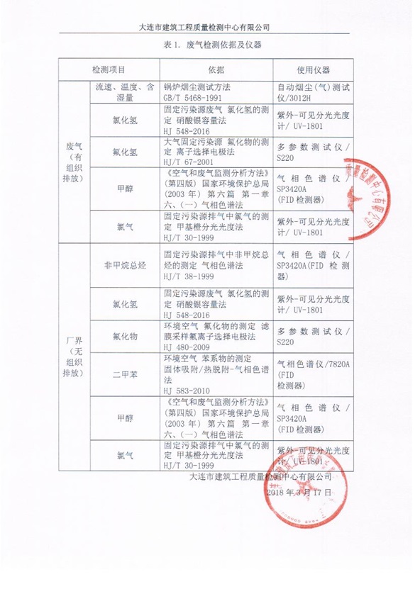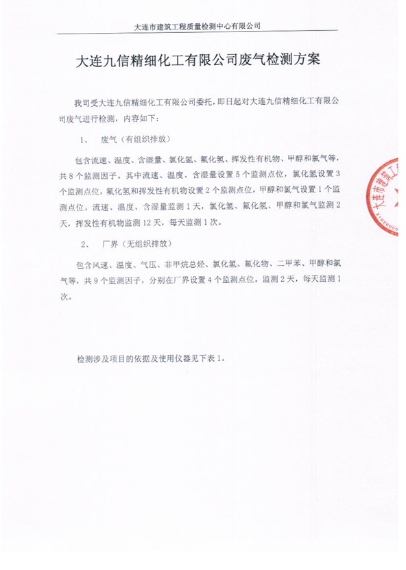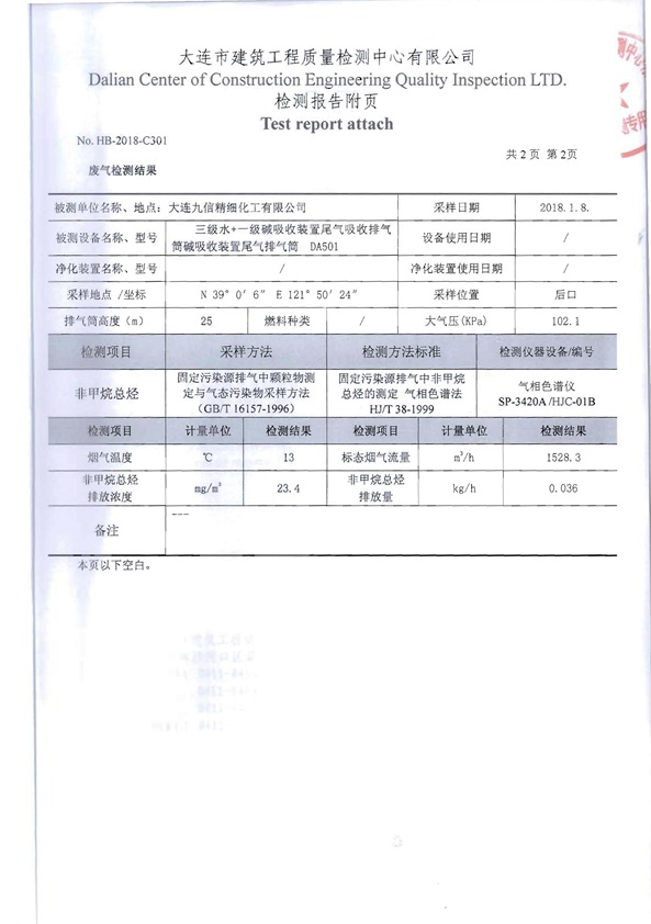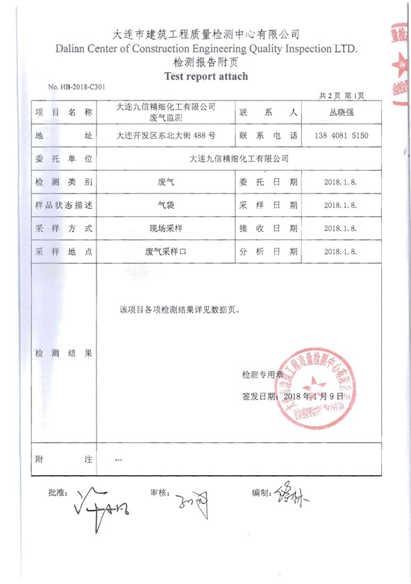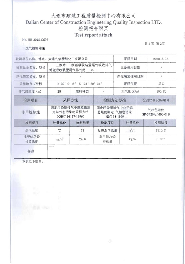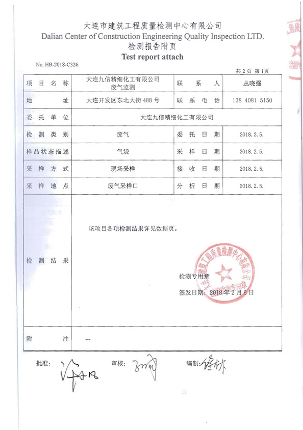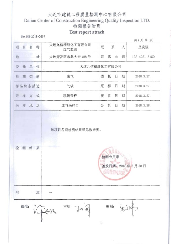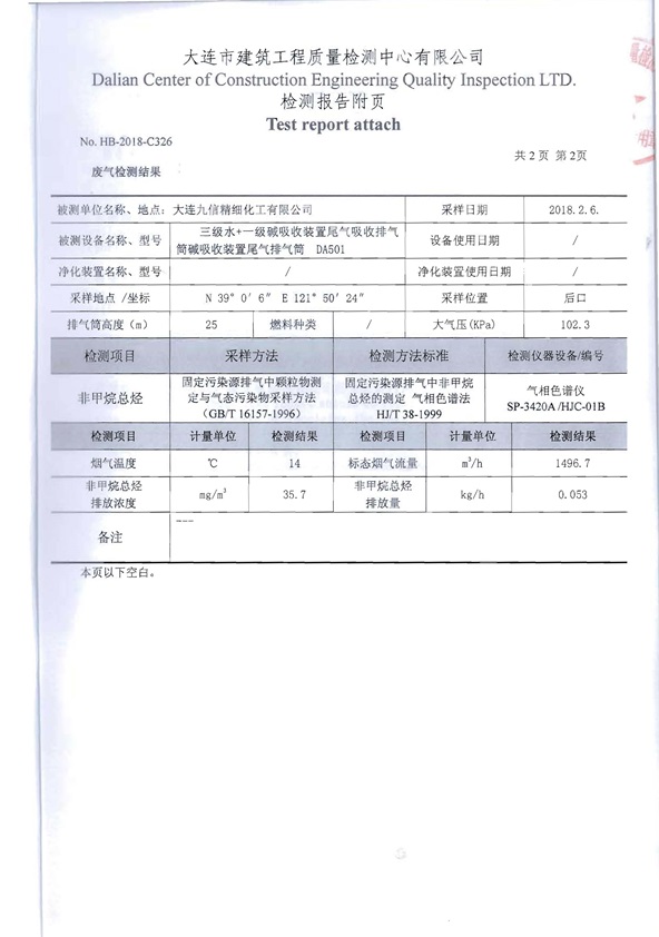 大連九信精細(xì)化工有限公司1-3月份非甲烷總烴監(jiān)測(cè)信息公開