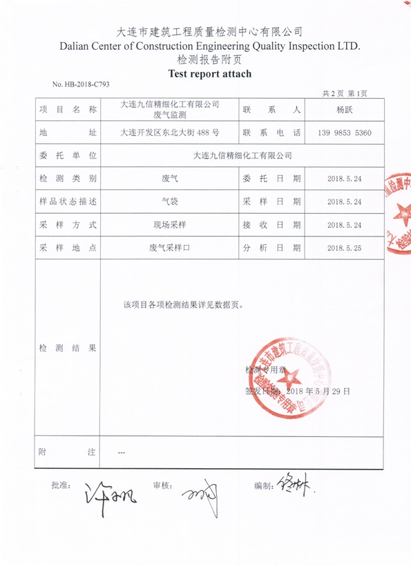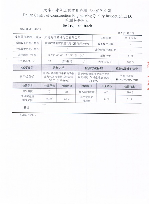 大連九信精細(xì)化工有限公司5月份非甲烷總烴監(jiān)測(cè)信息公開(kāi)